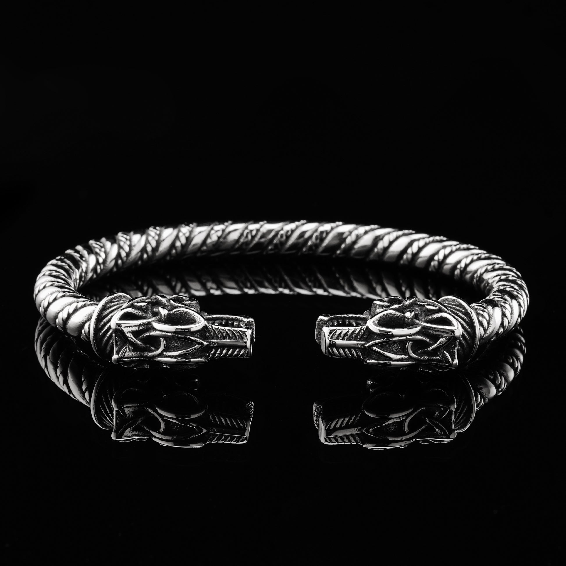 This bracelet features finely cast Fenrir wolf heads on both ends, inspired by Norse mythology. Designed in the classic Viking Torc style, it embodies the rugged aesthetics of Viking warriors, with every detail echoing the mythic traits of the legendary wolf god.